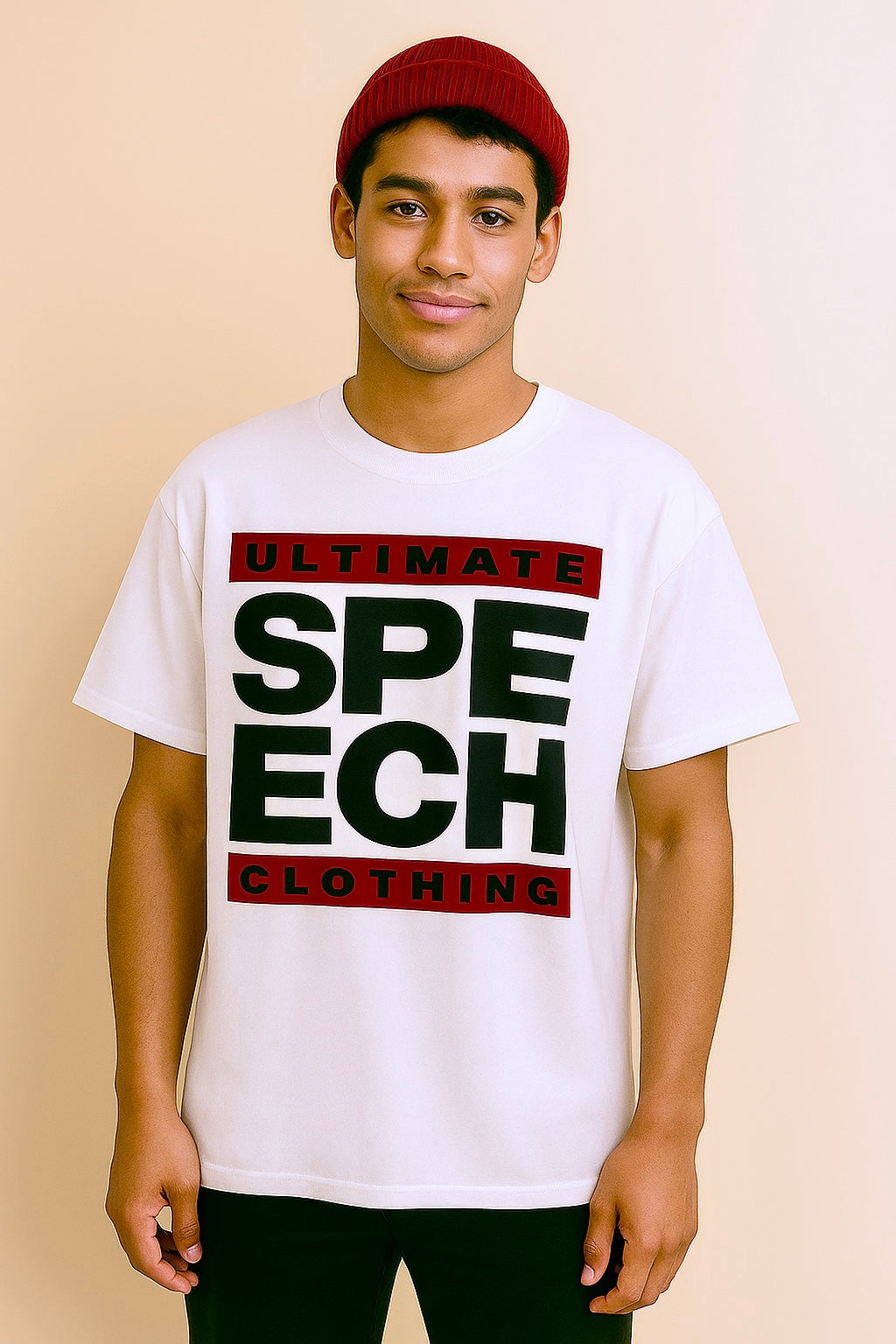 Drawing unmistakable inspiration from Run DMC’s historic logo. Featuring bold white text “SPEECH” framed by thick red bars at the top and bottom reading “ULTIMATE” and “CLOTHING,” this top channels not only the visual style of the legendary hip-hop group but also the ethos of self-expression and classic street attitude. This is an homage that goes beyond mere aesthetics, celebrating Run DMC’s influence on both fashion and music history.