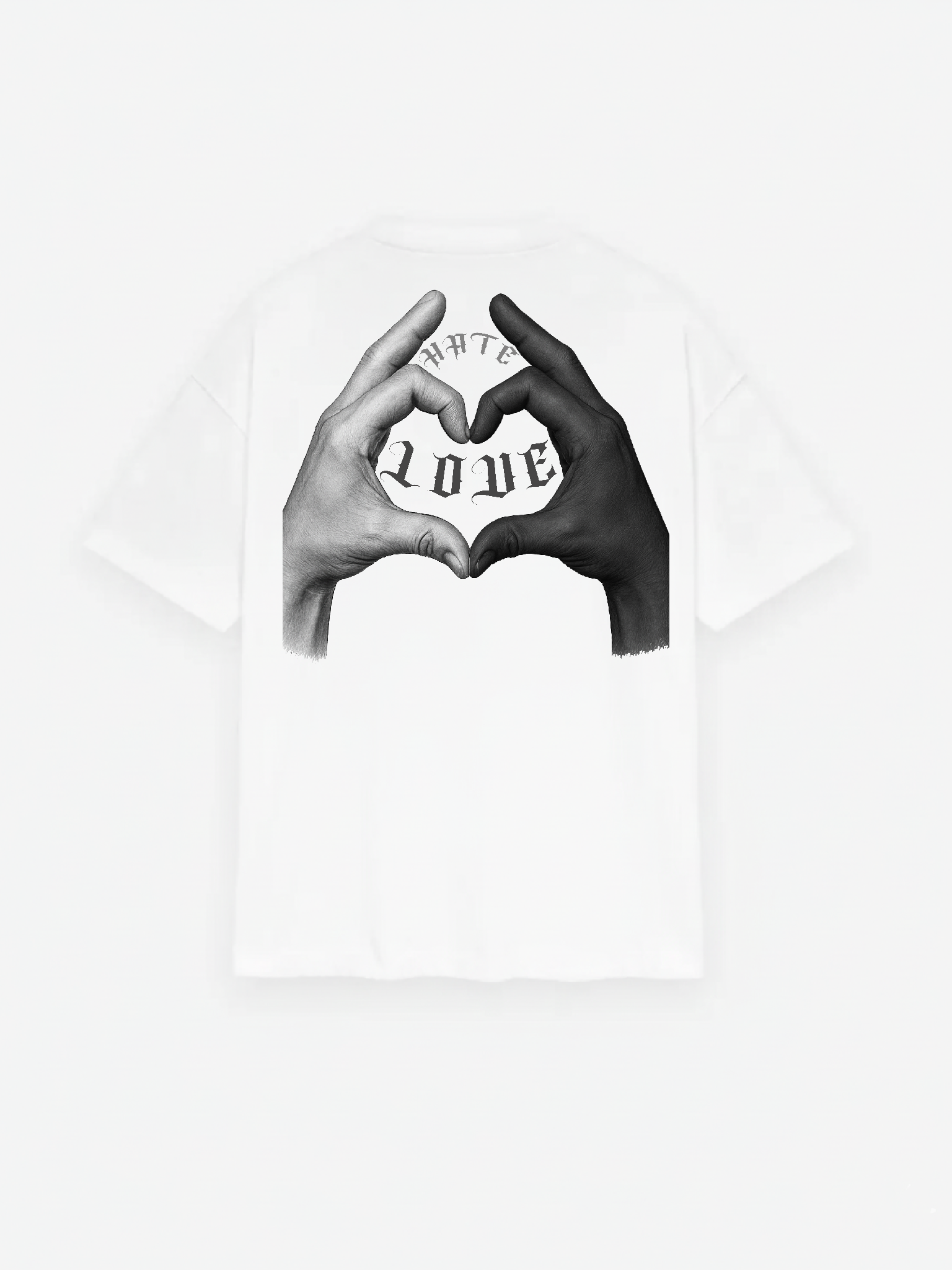 This design captures a powerful duality, The artwork shows two hands forming a heart, symbolising unity, connection, and positivity. Inside the shape, the bold gothic-style word LOVE stands out as the core message. Above it, the subtle stretch of the middle fingers forms the word HATE, representing the opposite energy we all carry within us.